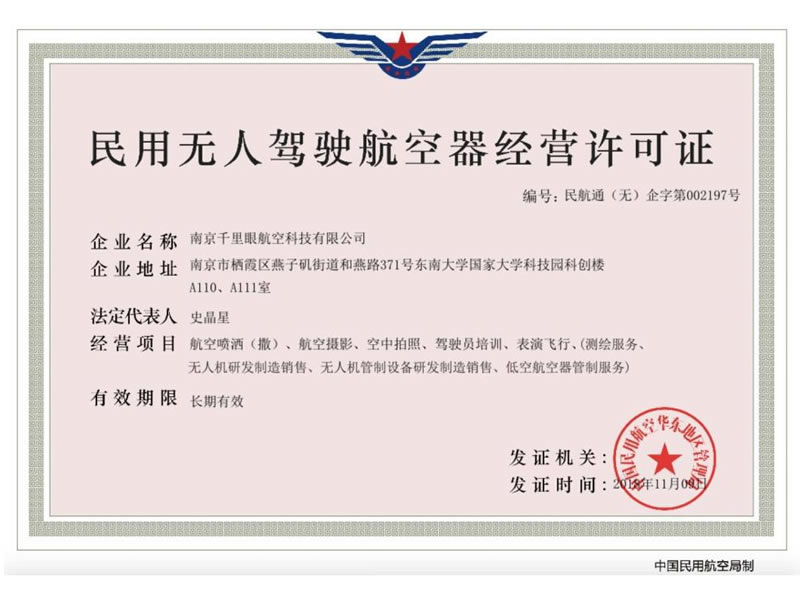 南京千里眼航空科技有限公司成立于2016年3月,创始团队为军队原专业技术人员,专注于工业级无人飞行器、无人机管制设备的研发、生产,属于国家级高 新技术企业,是江苏省和南京市重点支持的创新型科技企业。