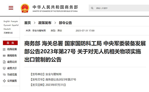 2023年7月31日,四部门联合发布了关于无人机的两个公告,分别对部分无人机专用的发动机、无线电通信设备以及重要搭载,还有民用反无人机系统等实施出口管制。对于消费级的...